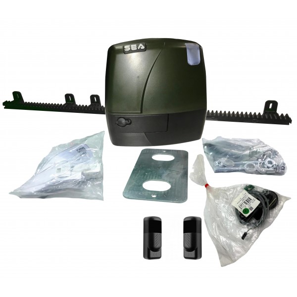 Kit Motor Mercury 400 + encoder + fotocélula + receptor + 2 emisores + 4 metros de cremallera de nylon, todo lo necesario para automatizar puertas correderas residenciales de hasta 400 kg de peso y 4 metros de largo. Con encoder y fotocélula para mayor seguridad y cumplimiento de las normativas vigentes.