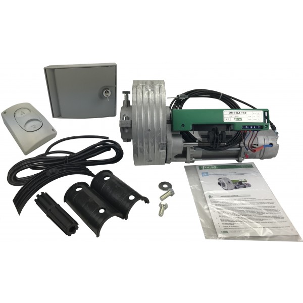 Kit para puerta enrollable compuesto por motor OMEGA160 con bloqueo, Desbloqueo de palanca exterior y pulsador sube-baja interior.