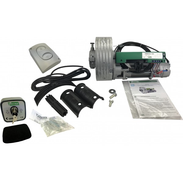 Kit para puerta enrollable compuesto por motor OMEGA160 con bloqueo, Llavín para exterior y pulsador sube-baja para interior.