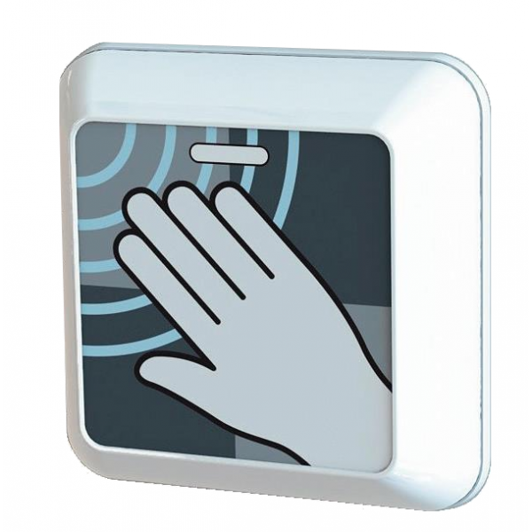 Pulsador sin contacto, por proximidad, para la activación de puertas automáticas.